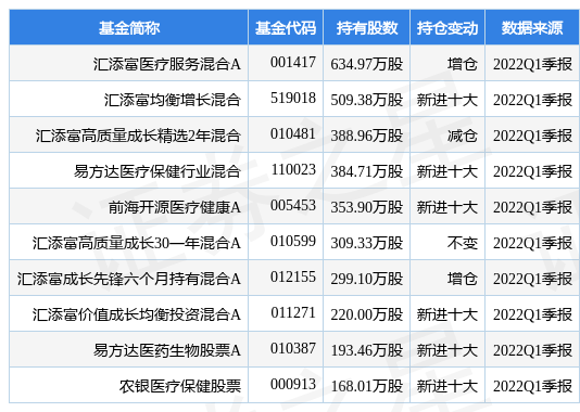 其中持有数量最多的基金为汇添富医疗服务A,目前规模为38.44亿元,最新净值1.605(5月13日),较上一交易日上涨0.12%,近一年下跌30.16%。该基金现任基金经理为刘江。