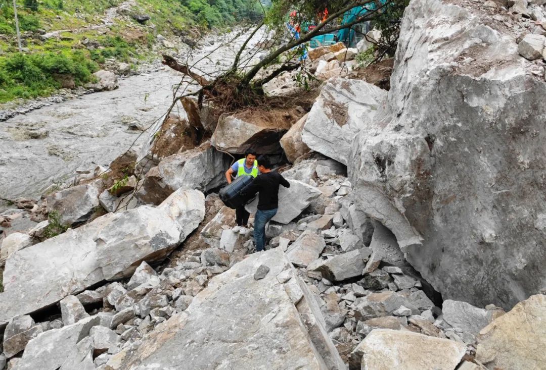 ▲中海达应急队携带无人机翻越山体滑坡路段