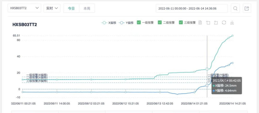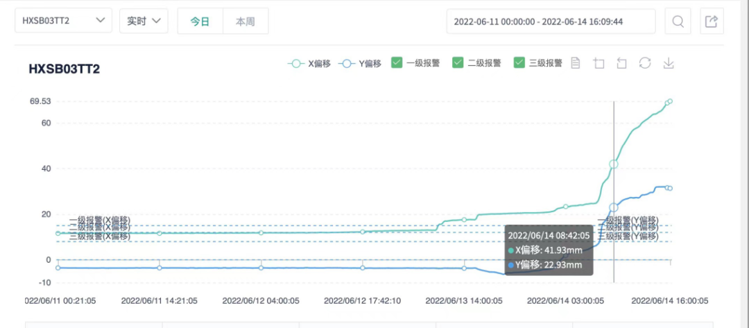 通过查看,安置点的叶水清地灾点(编号350702010412)在6月13日10时因屋后滑坡发生二级预警,中海达监测云平台显示HXSB03TT2深部位移监测数据曲线异常,分别达到X位移偏移达20mm、Y位移偏移达到-3.77mm,疑似异常波动,联合监测小组通知预警人员持续观察。14日7时,该地灾点的数据发生变化引起二次预警,HXSB03TT2深部位移监测数据曲线异常分别达到X位移偏移达27.61mm、Y位移偏移达到8.19mm,HXSB03TT1深部位移监测数据曲线异常,分别达到X位移偏移达-90.51mm、Y位移偏移达到-22.08mm。