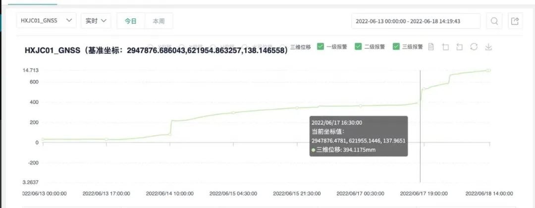 ▲施旺荣地灾点出现险情,中海达监测云平台多次警报