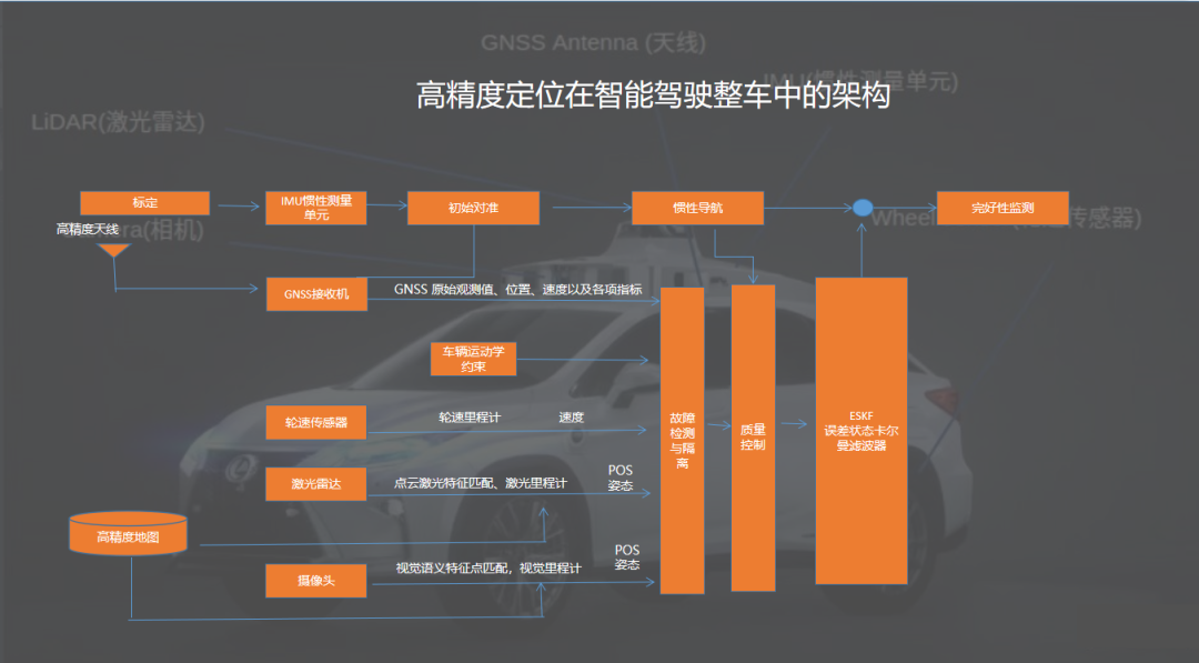 汽车在自动驾驶状态时,自车的位置需要借助高精地图标配的定位系统来完成,它包括卫星定位模块,如RTK/PPP定位技术,通过接收地基增强网络接收GNSS信号来确定车辆位置;而在一些隧道、城市峡谷、高架桥和林荫道路等场景,卫星信号比较弱的情况下,需要借助一些物理工具来确定车辆位置,如IMU,即惯性测量单元,它根据车辆方位、姿态、速度等信息推算位置。