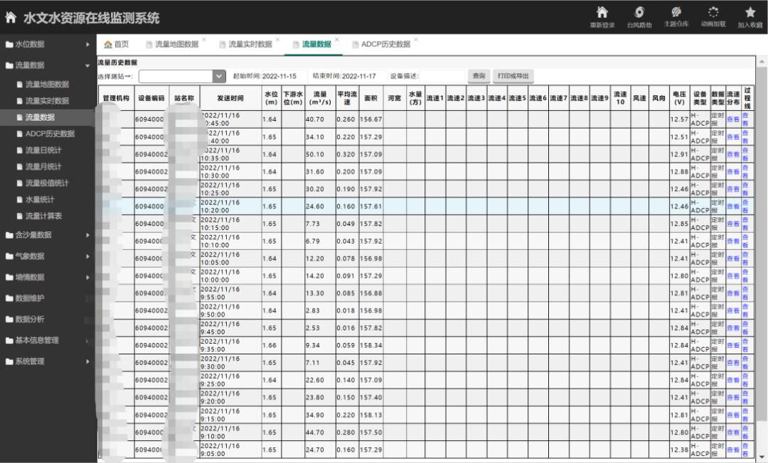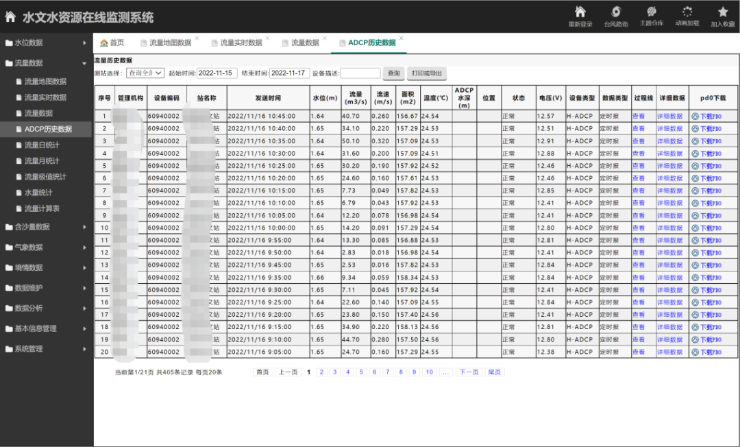 通过智能管理平台的ADCP历史数据界面,水文站不仅可以查看赤水溪目前为止所有的流速、流量、水位面积、电压等信息,而且还能查看水位、流速、流量过程线等历史数据,方便水文站全面了解赤水溪各个时段的水情动态信息,以及掌握赤水溪的水情变化规律。同时,水文站还可以下载保存ADCP的原始PD0数据。
