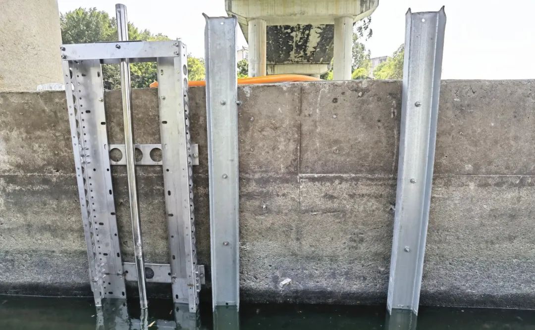 通过现场勘察,作业人员将ADCP测流传感器及支架安装在赤水溪上一座大桥的靠岸桥墩上。为阻挡上游垃圾、水草等漂浮物破坏ADCP测流传感器及支架,作业人员先是在上游位置用高强度膨胀钉安装了两根槽钢,其后在槽钢下游安装由工业级304不锈钢制成,且支持纵倾、横摇、高低可调节和自锁的支架。
