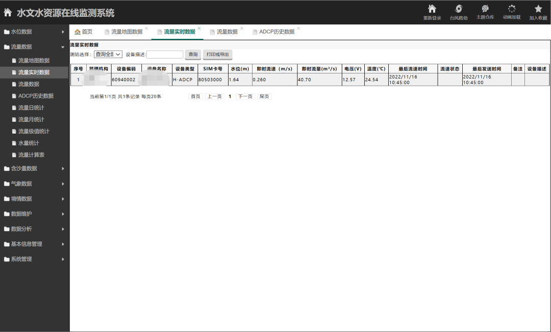 通过智能管理平台的流量实时数据界面,水文站可以实时查看赤水溪最新的流速、流量,以及水位、水温、电压等信息,方便水文站及时了解赤水溪最新的水情信息。