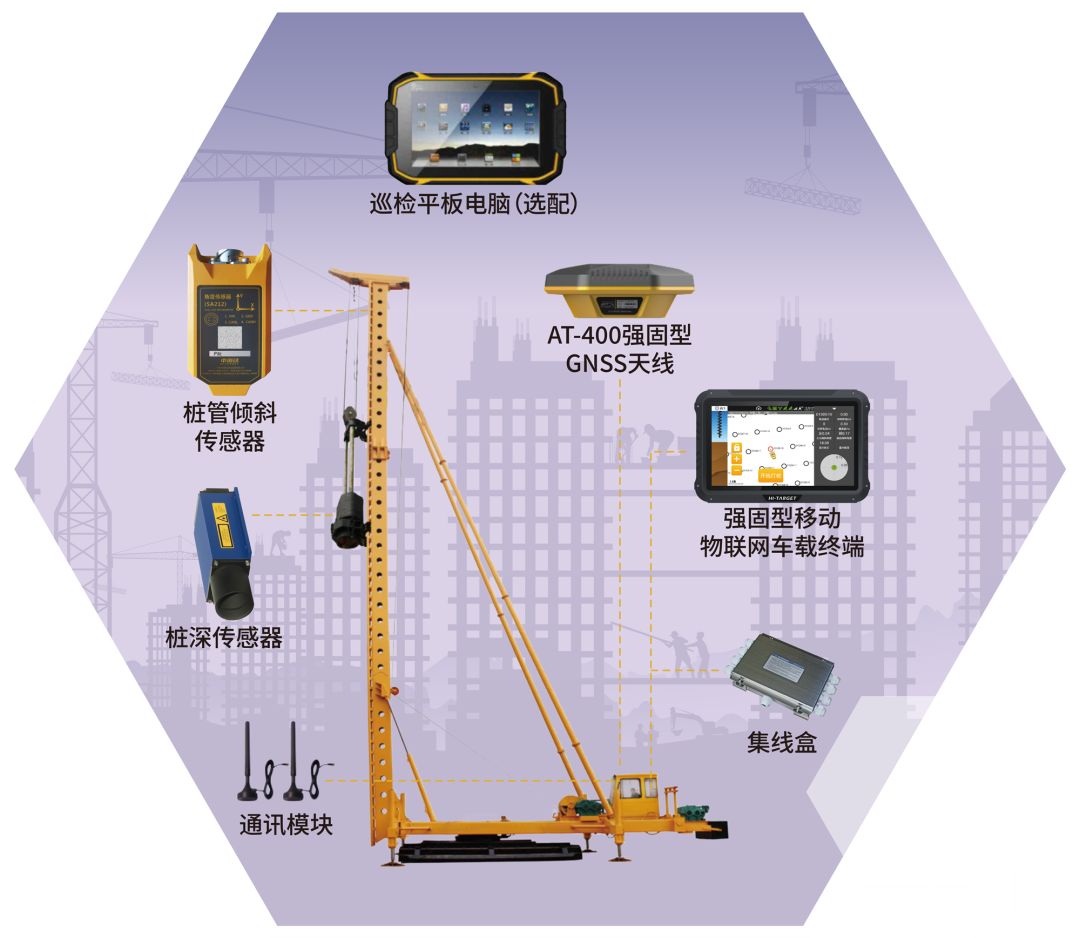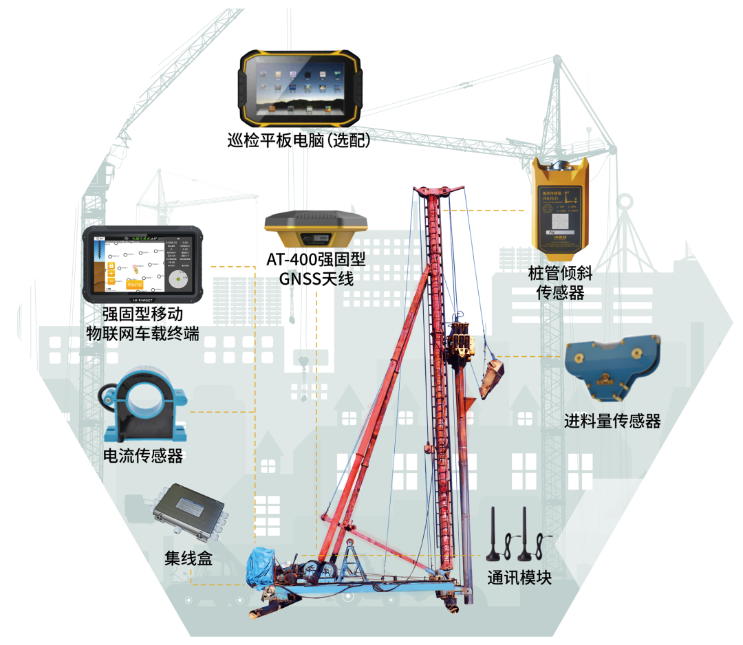 ▲左右滑动查看复合地基施工系统组成系统(依次是PDS500 CFG桩基施工管理系统、PDS100桩机引导系统、碎石桩施工管理系统、强夯施工管理系统、PDS600锤击桩施工管理系统)