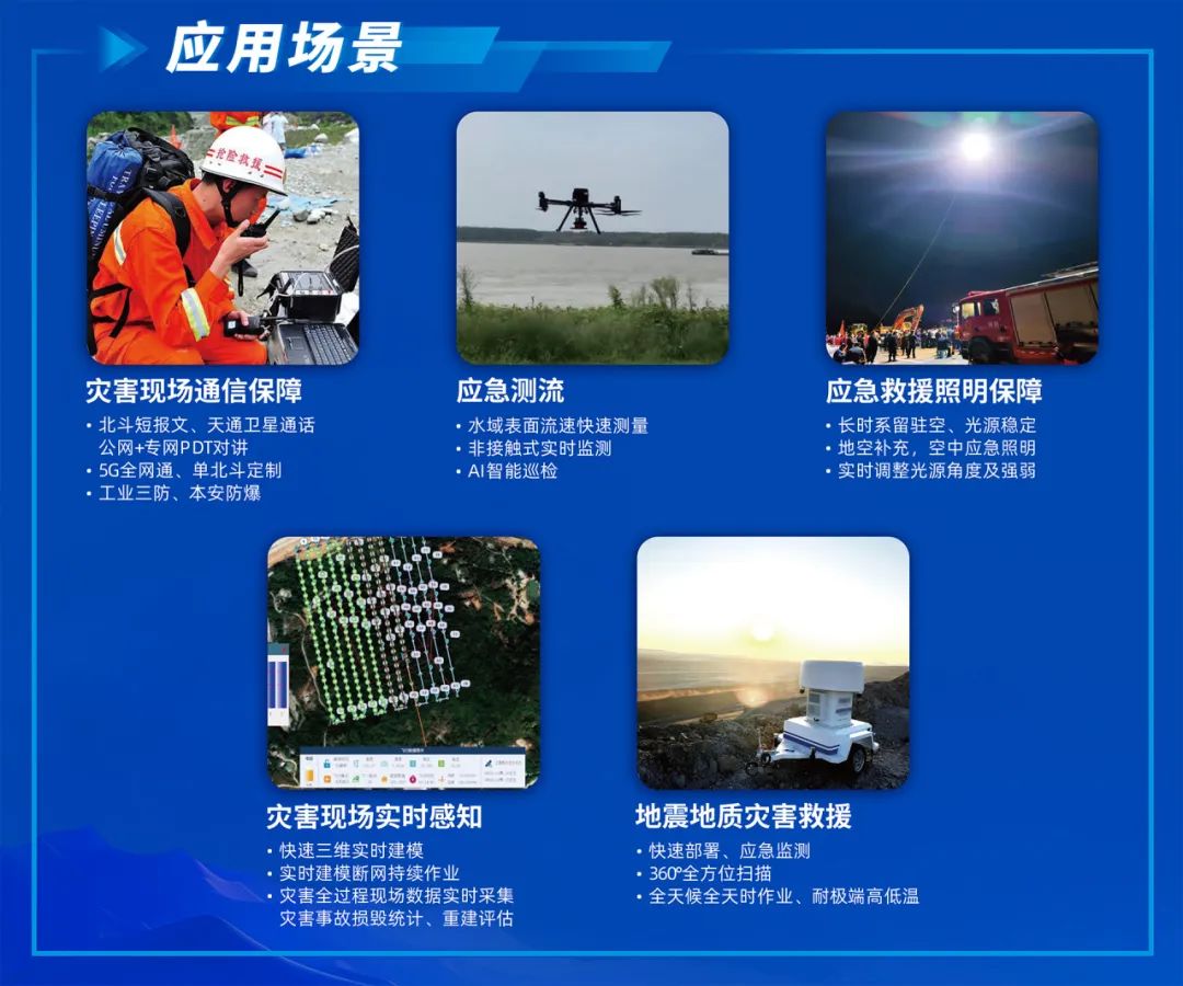以北斗卫星导航定位技术为基础,融合无人机、无人船、机器人、激光雷达、倾斜摄影、单/多波束、声呐等技术,面向应急通信与预警指挥、水域救援、应急测流、抗洪抢险、地质灾害救援等应急场景提供水陆空天一体化应用的整体解决方案。