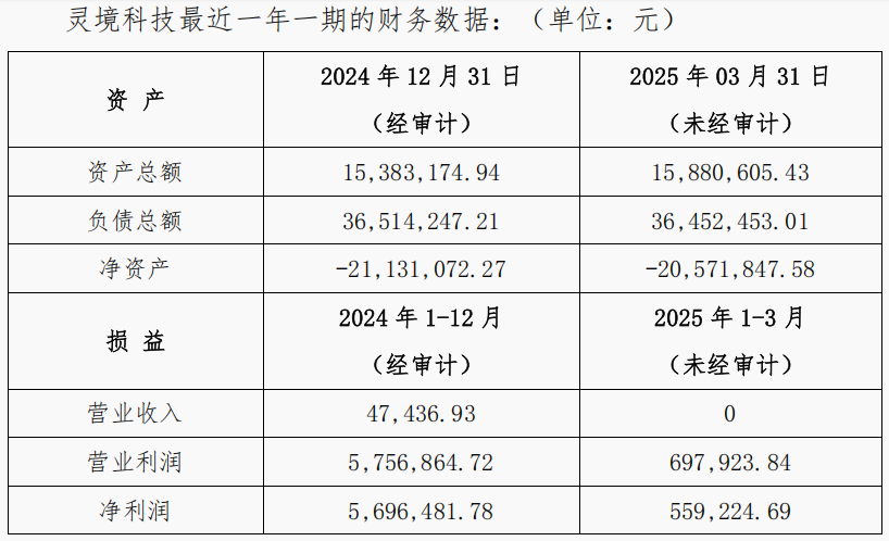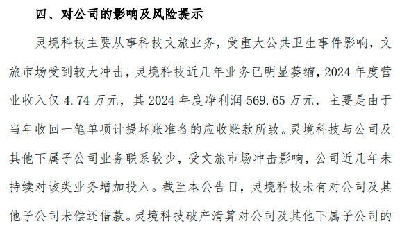 从本次公告看,文旅市场受到较大冲击,灵境科技近几年业务已明显萎缩,2024年度营业收入仅4.74万元,净利润569.65万元,主要是由于当年收回一笔单项计提坏账准备的应收账款所致。