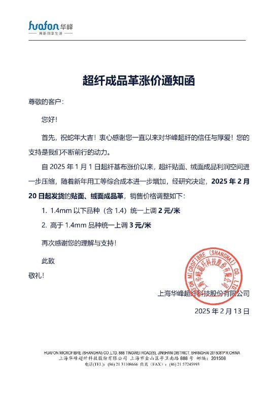 华峰超纤表示,自 2025 年1月1日超纤基布涨价以来,超纤贴面、绒面成品利润空间进一步压缩,随着新年用工等综合成本进一步增加,此次调价系“经研究决定”,希望大家理解与支持。