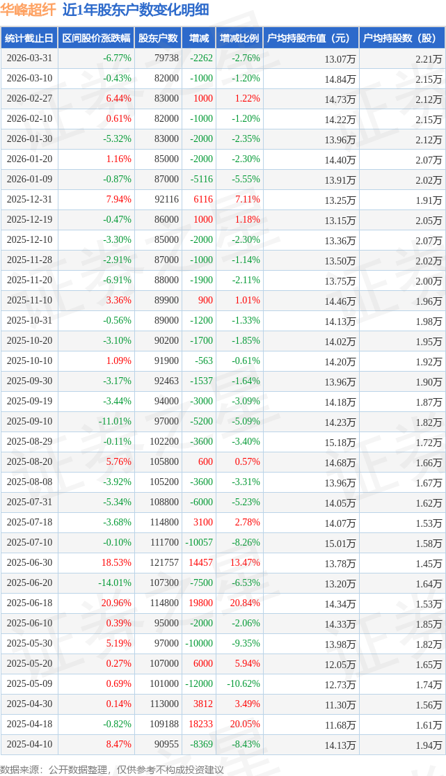 从股价来看,2026年3月20日至2026年3月31日,华峰超纤区间跌幅为6.77%,在此期间股东户数减少2262.0户,减幅为2.76%。