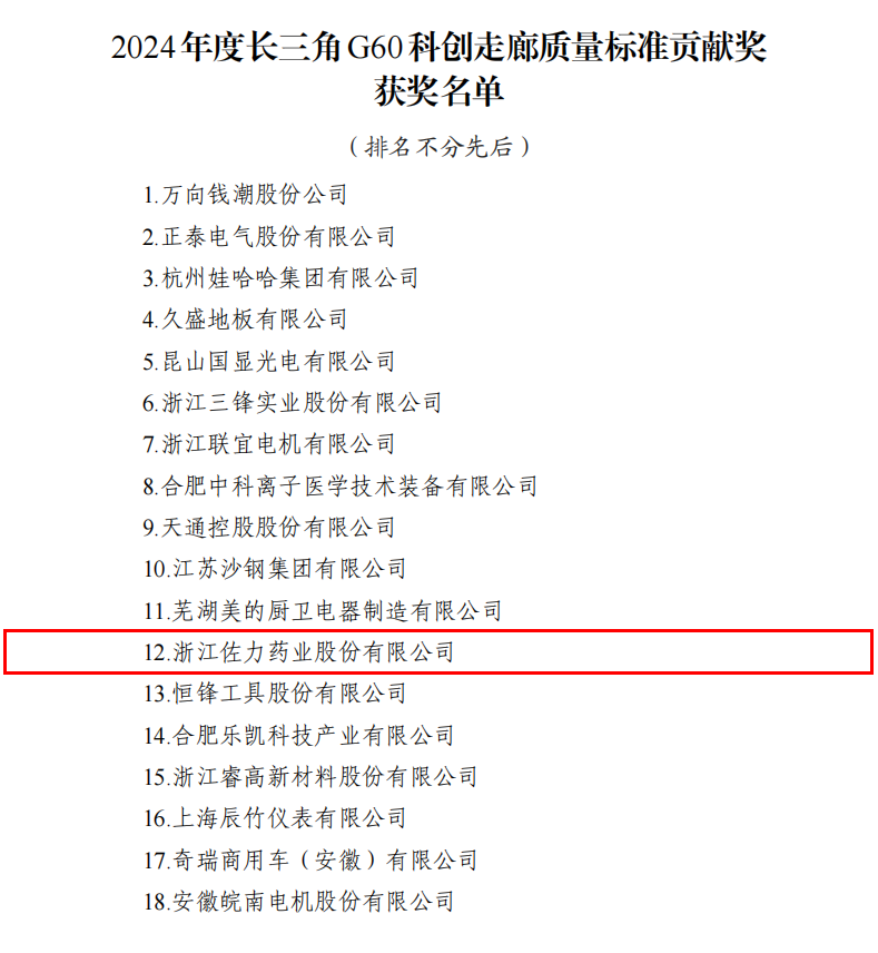 9月,经严格评审,长三角G60科创走廊联席会议办公室通报了“2024年度长三角G60科创走廊质量标准贡献奖”获奖企业名单。佐力药业由于实施严格的质量管理,以及在实践活动中取得的在产品开发、标准制定、技术攻关、质量安全、市场效益、行业地位等方面的成效,被授予“长三角G60科创走廊质量标准贡献奖”。