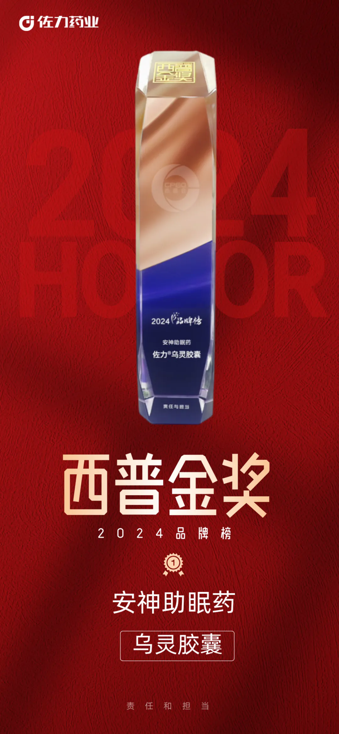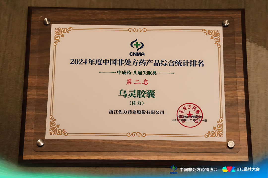 12月20-22日,由中国非处方药物协会主办的以“相信品牌的力量”为主题的第二届OTC品牌大会在北京隆重举行。佐力药业凭借其明星产品:乌灵胶囊的出众优势,荣耀摘得“2024年度中国非处方药黄金大单品”及“2024年度中国非处方药产品综合统计排名:中成药头痛失眠类第二名”这两项重量级奖项。