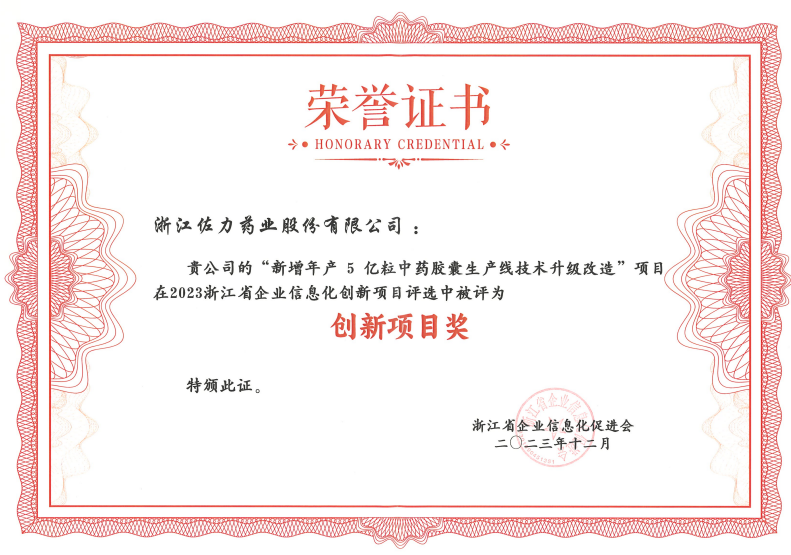 1月18日,佐力药业“新增年产 5 亿粒中药胶囊生产线技术升级改造”项目获评2023年度浙江省企业信息化创新项目奖。