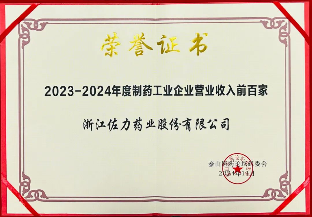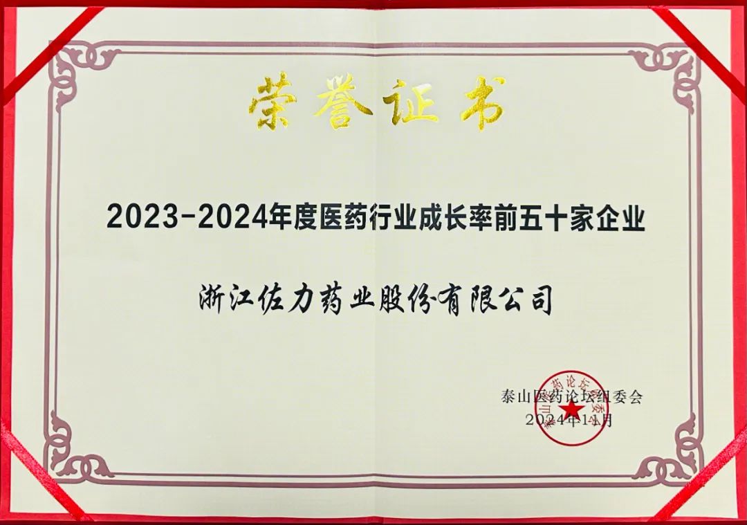11月5日,以全产业·大平台·深融合·共发展为主题的第三届泰山医药论坛暨2023-2024年度医药行业信息发布会在泉城济南隆重举办。此次盛会上,佐力药业一举获得了两项重要奖项:2023-2024年度医药行业增长率前五十家企业和2023-2024年度制药工业营业收入前百家企业。