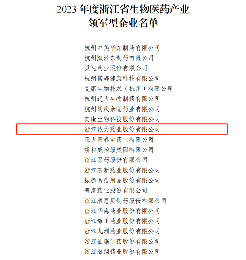 6月27日,浙江省经济和信息化厅发布了《2023年度浙江省生物医药产业重点企业名单(领军型和高成长型)》,佐力药业凭借其在生物医药领域的卓越表现和创新能力,荣获“浙江省生物医药产业领军型企业”称号。
