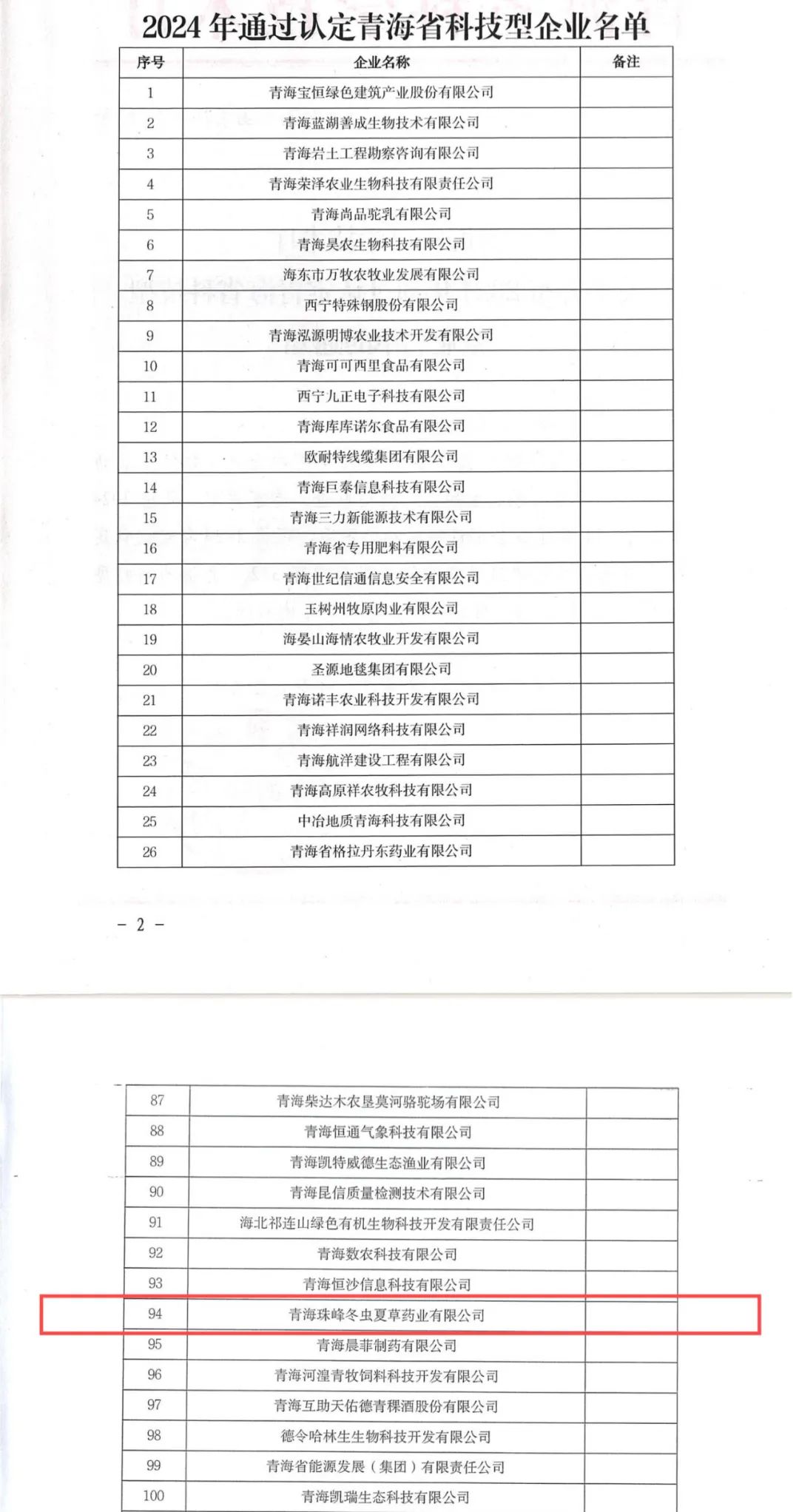 11月29日,佐力药业子公司青海珠峰冬虫夏草药业有限公司入选青海省科技型企业名单。