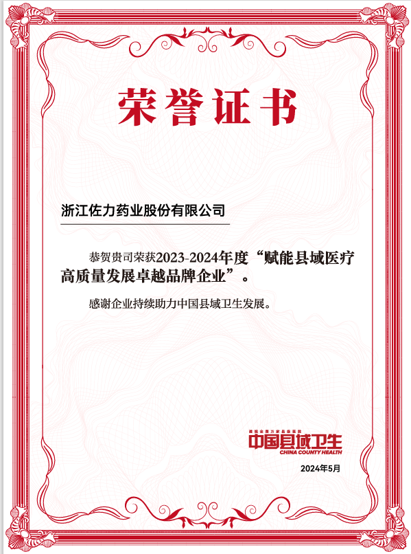 2024年,佐力药业站在“十四五”同频共振的新起点、高质量发展的新阶段,紧紧围绕“高增长、高质量、可持续”的发展目标,坚定不移聚焦营销、聚焦研发,做好合规保障、产能保障、人才保障,全力向百亿目标发起冲刺,以持续高质量、高增长发展,为中医药事业和产业发展贡献佐力力量。我们斩获的每一项荣誉,都见证着佐力人的不懈努力。