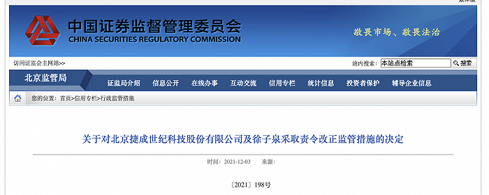 12月3日,北京证监局发布关于对北京捷成世纪科技股份有限公司及徐子泉采取责令改正监管措施的决定。经查,该公司存在以下问题:关联方资金占用,公司部分财务处理不规范以及业绩预告披露不准确。