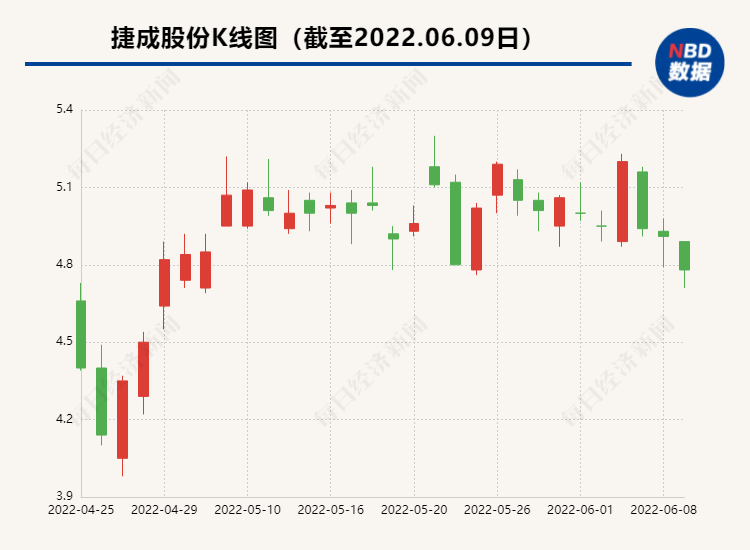 可能受多个利空消息影响,捷成股份股价近3个交易日累计下跌约8.08%,截至6月9日收盘报4.78元/股。Wind数据显示,6月7日北向资金净卖出捷成股份6528.1万元,持股比例降至1.14%;6月8日北向资金净卖出捷成股份2427.76万元,持股比例降至0.95%。