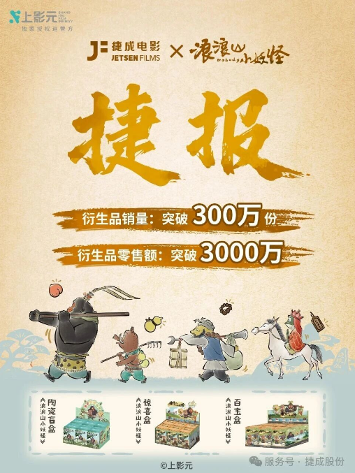 在《浪浪山小妖怪》IP的衍生开发中,捷成股份突破了传统潮玩门店和线上平台的局限,由灵鼠设计、桑尼森迪生产的塑料盲盒拓展了包括张一鸣、零食很忙、便利店等零食终端,实现多渠道跨界全方位渗透。截至目前,浪浪山系列衍生品累计销量已突破300万份,销售额突破3000万元。同时,公司即将推出的浪浪山联名食玩商品也将延续这一战略,进一步丰富IP商品矩阵。