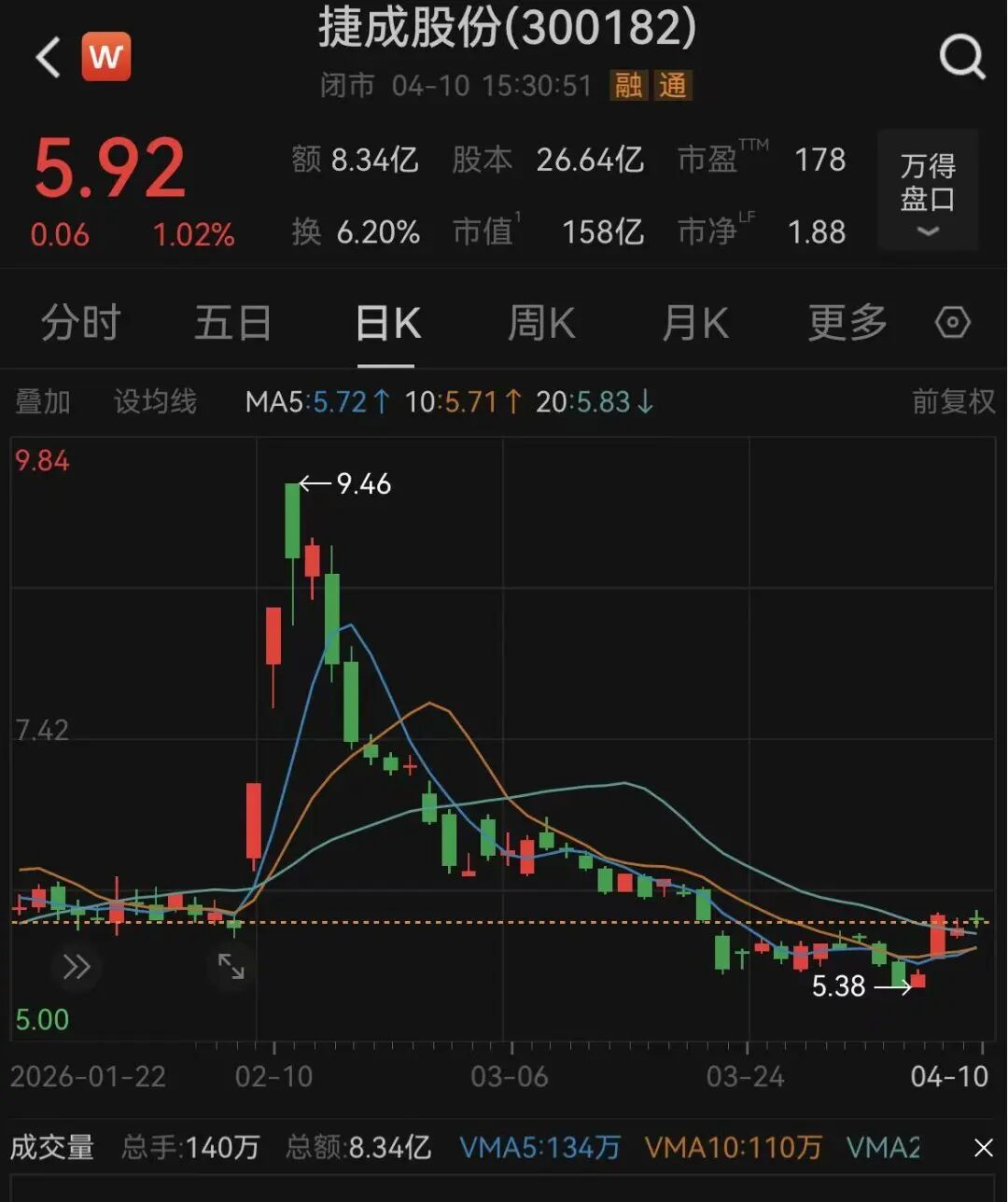 数据显示,4月10日收盘,捷成股份报5.92元/股,涨幅为1.02%,总市值为158亿元。