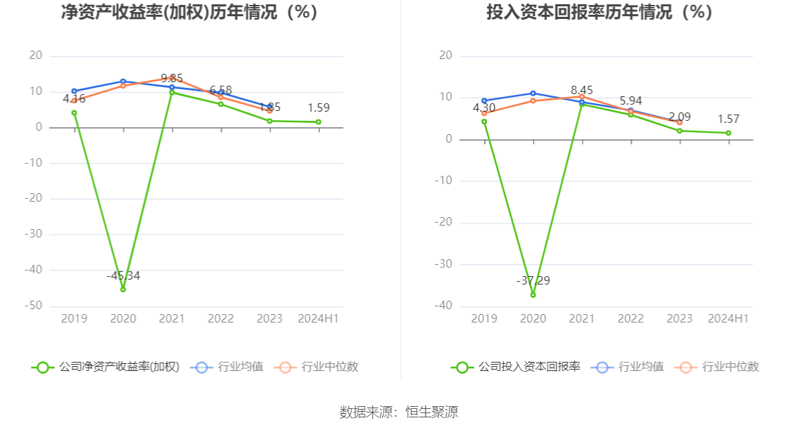 数据显示,2024年上半年公司加权平均净资产收益率为1.59%,较上年同期增长0.11个百分点;公司2024年上半年投入资本回报率为1.57%,较上年同期增长0.14个百分点。