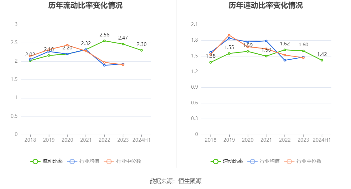 2024年上半年,公司流动比率为2.30,速动比率为1.42。