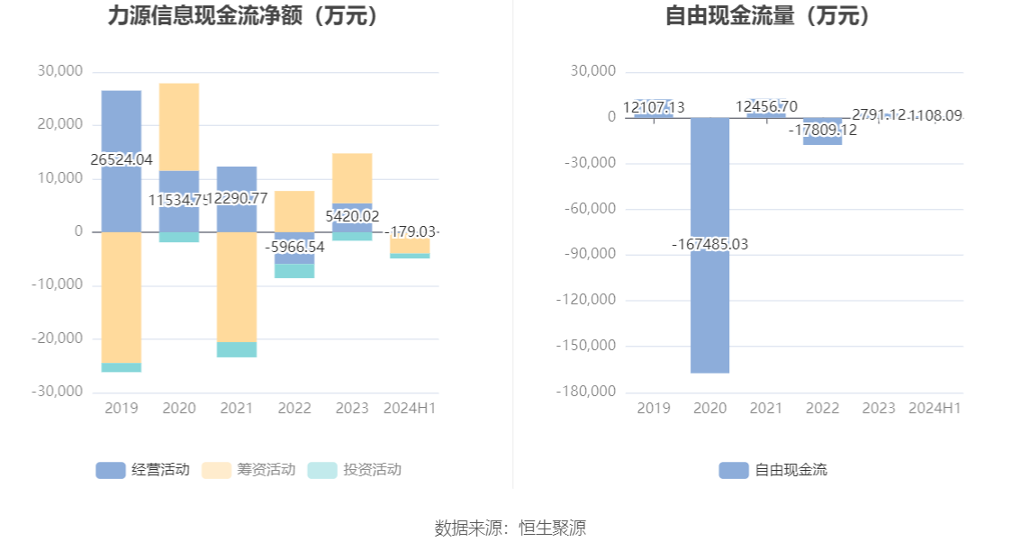 2024年上半年,公司经营活动现金流净额为-179.03万元,同比减少2.45亿元;筹资活动现金流净额-3808.75万元,同比减少7091.30万元;投资活动现金流净额-942.07万元,上年同期为-1682.94万元。