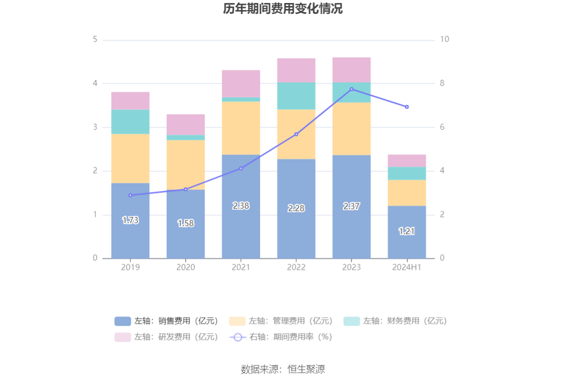 2024年上半年,公司期间费用为2.38亿元,较上年同期增加4204.08万元;但期间费用率为6.94%,较上年同期下降0.62个百分点。其中,销售费用同比增长25.22%,管理费用同比增长9.97%,研发费用同比增长0.66%,财务费用同比增长67.49%。