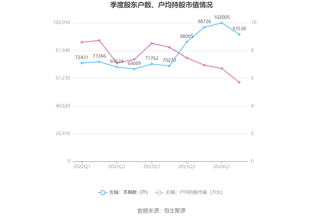 筹码集中度方面,截至2024年上半年末,公司股东总户数为9.35万户,较一季度末下降了8467户,降幅8.30%;户均持股市值由一季度末的6.71万元下降至5.71万元,降幅为14.90%。