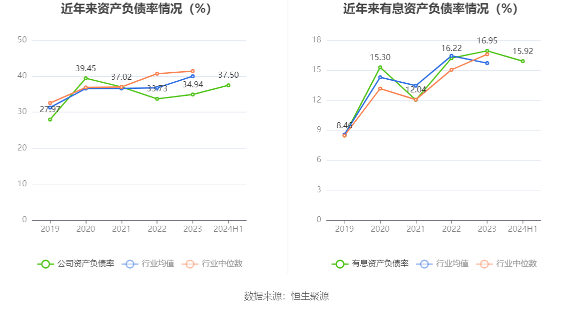 在偿债能力方面,公司2024年上半年末资产负债率为37.50%,相比上年末上升2.56个百分点;有息资产负债率为15.92%,相比上年末下降1.03个百分点。