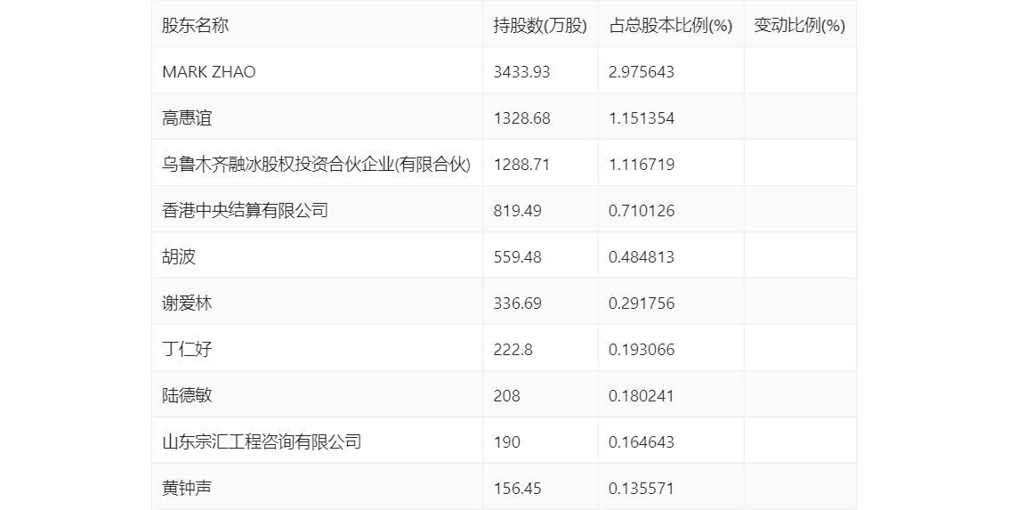 半年报显示,2024年上半年末公司十大流通股东中,新进股东为谢爱林、丁仁好、陆德敏、山东宗汇工程咨询有限公司、黄钟声,取代了一季度末的J.P.Morgan Securities PLC-自有资金、赵佳生、焦成、青岛清芯民和投资中心(有限合伙)、北京君成朱红二号私募证券投资基金。在具体持股比例上,香港中央结算有限公司持股有所上升。