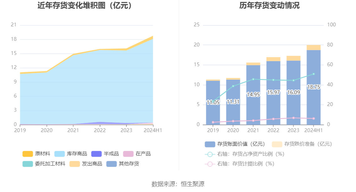 从存货变动来看,截至2024年上半年末,公司存货账面价值为18.75亿元,占净资产的50.98%,较上年末增加2.67亿元。其中,存货跌价准备为1.26亿元,计提比例为6.29%。