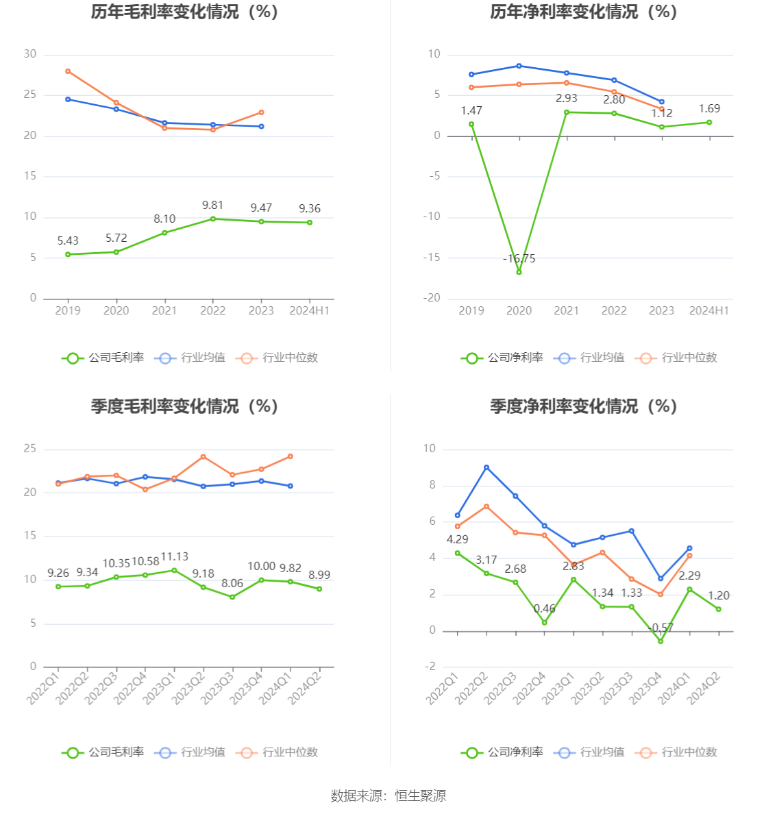 2024年上半年,公司毛利率为9.36%,同比下降0.71个百分点;净利率为1.69%,较上年同期下降0.33个百分点。从单季度指标来看,2024年第二季度公司毛利率为8.99%,同比下降0.19个百分点,环比下降0.83个百分点;净利率为1.20%,较上年同期下降0.14个百分点,较上一季度下降1.09个百分点。