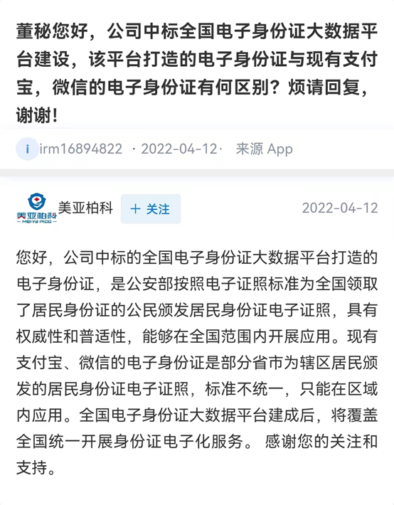 此前,美亚柏科在投资者互动平台表示,公司中标的居民身份证电子证照大数据平台打造的电子身份证具有权威性和普适性,能够在全国范围内开展应用。“现有支付宝、微信的电子身份证是部分省市为辖区居民颁发的居民身份证电子证照,标准不统一,只能在区域内应用。全国电子身份证大数据平台建成后,将覆盖全国统一开展身份证电子化服务。”