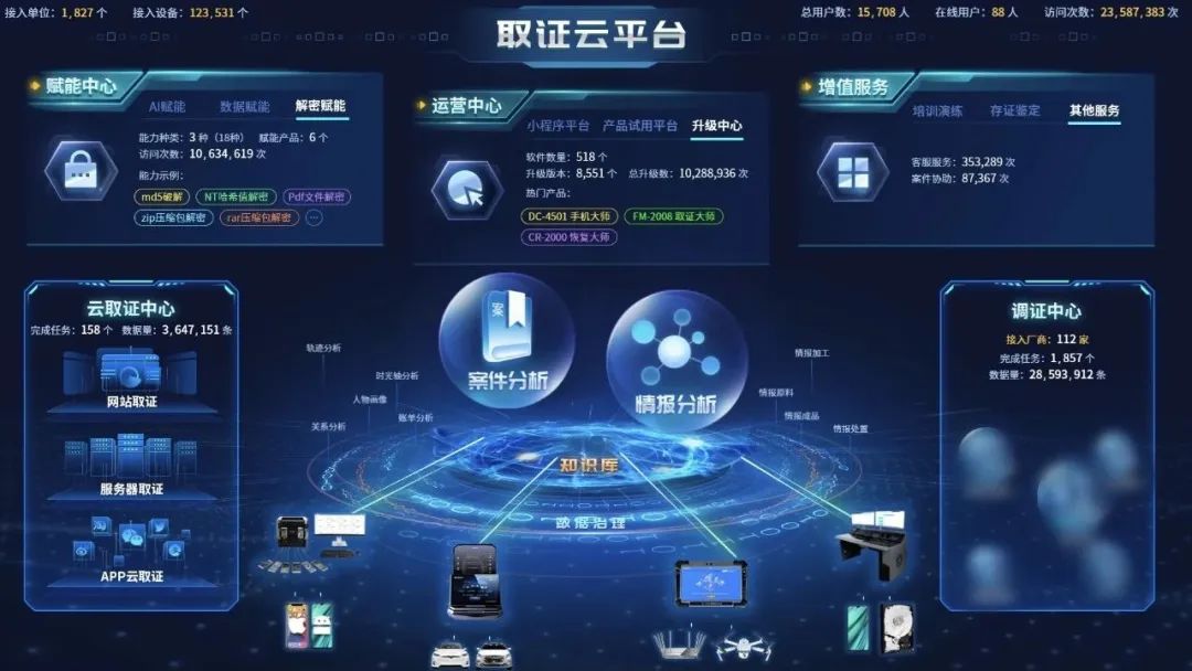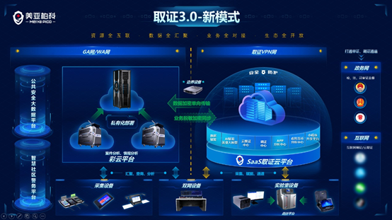在取证3.0新模式下,美亚柏科构建全国统一的取证VPN网,在取证网内搭建统一的取证云平台,提供数据赋能、AI赋能和知识库赋能,提供SaaS化的云取证、App分析、区块链分析和调证服务等。