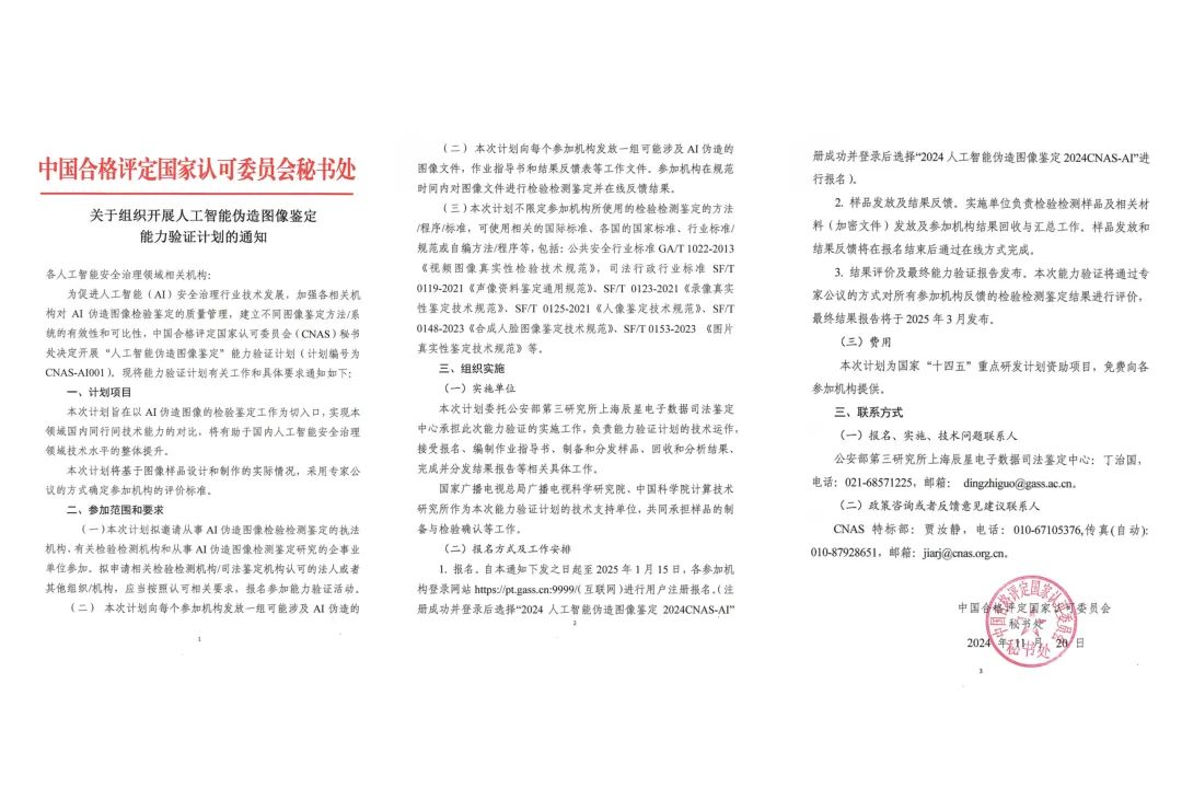 近日,中国合格评定国家认可委员会(CNAS)秘书处发布《关于组织开展人工智能伪造图像鉴定能力验证计划的通知》,邀请从事AI伪造图像检验检测鉴定的执法机构、有关检验检测机构和从事AI伪造图像检测鉴定研究的企事业单位参加相关鉴定能力的验证,以促进人工智能(AI)安全治理行业技术发展,加强各相关机构对AI伪造图像检验鉴定的质量管理,建立不同图像鉴定方法/系统的有效性和可比性。