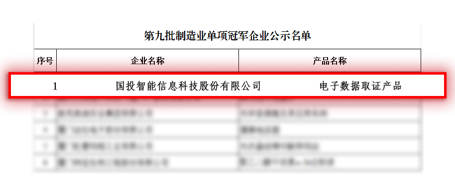 近日,工业和信息化部公示了第九批国家级制造业单项冠军企业名单,国投智能信息科技股份有限公司凭借“电子数据取证产品”成功入选(点击文末“阅读原文”查看详情)。