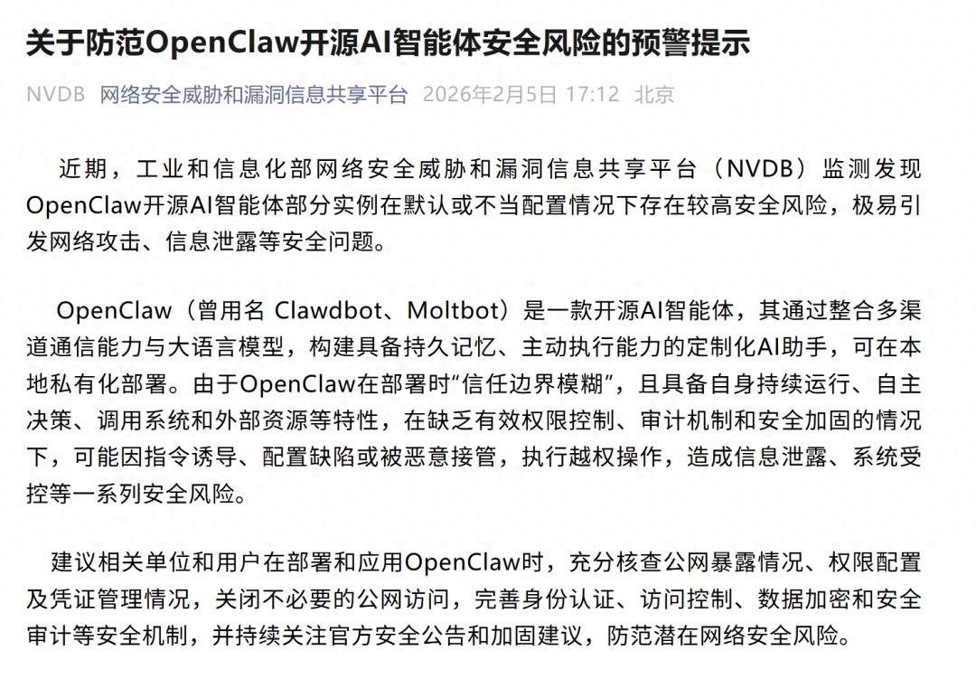 近期,开源AI智能体OpenClaw凭借本地私有化部署、自主执行系统操作、全场景自动化任务处理等核心能力,迅速成为AI技术落地应用的热门选择。然而,伴随其普及规模持续扩大,产品暴露出的系统性安全风险也引发高度关注——工业和信息化部网络安全威胁和漏洞信息共享平台、国家计算机网络应急技术处理协调中心(CNCERT)相继发布重磅安全预警。