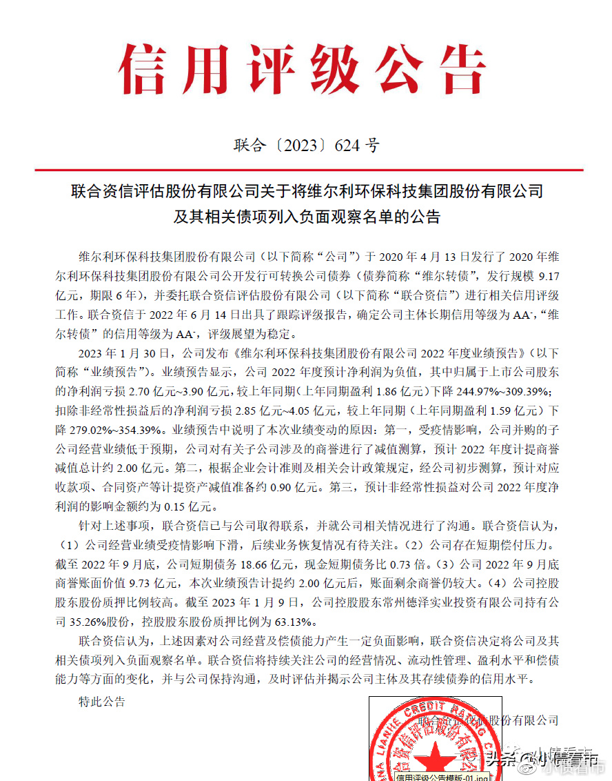 联合资信认为,维尔利2022年业绩预亏、短期偿付压力大、商誉高企以及控股股东股份质押比例较高等事项,对公司经营及偿债能力产生一定负面影响。