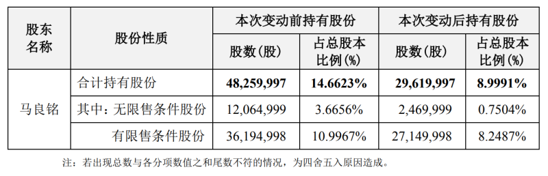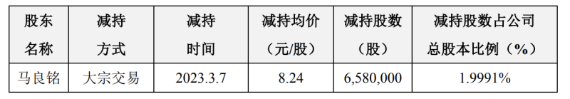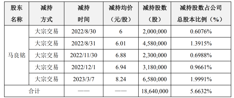 但据此次公告透露,在2022年8月30日至2023年3月7日期间,马良铭先后5次通过大宗交易的方式,累计减持公司股份1864万股,减持比例达5.6632%,已超过公司总股本的5%,共累计套现1.316亿元。