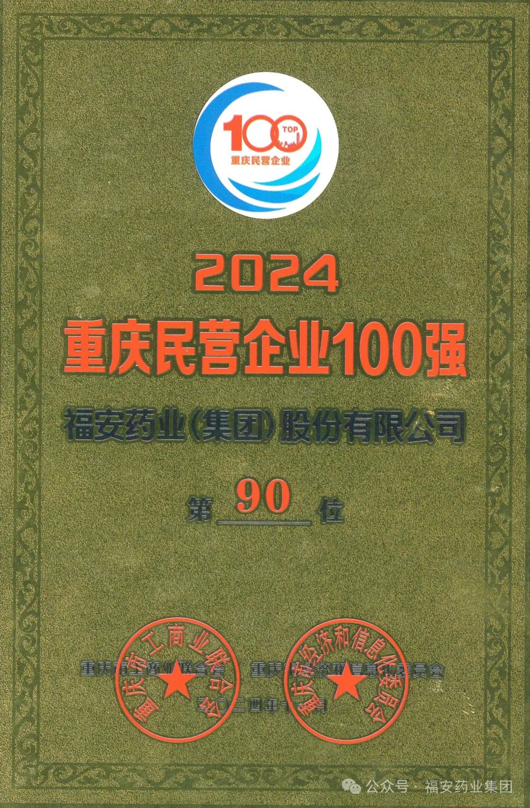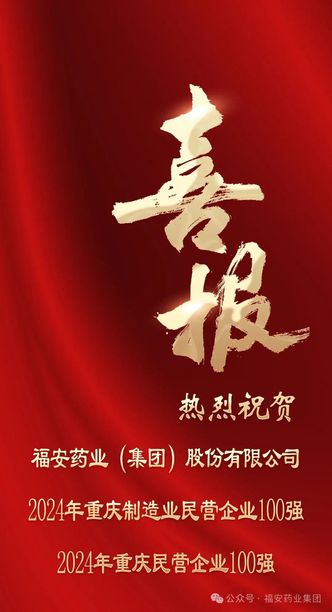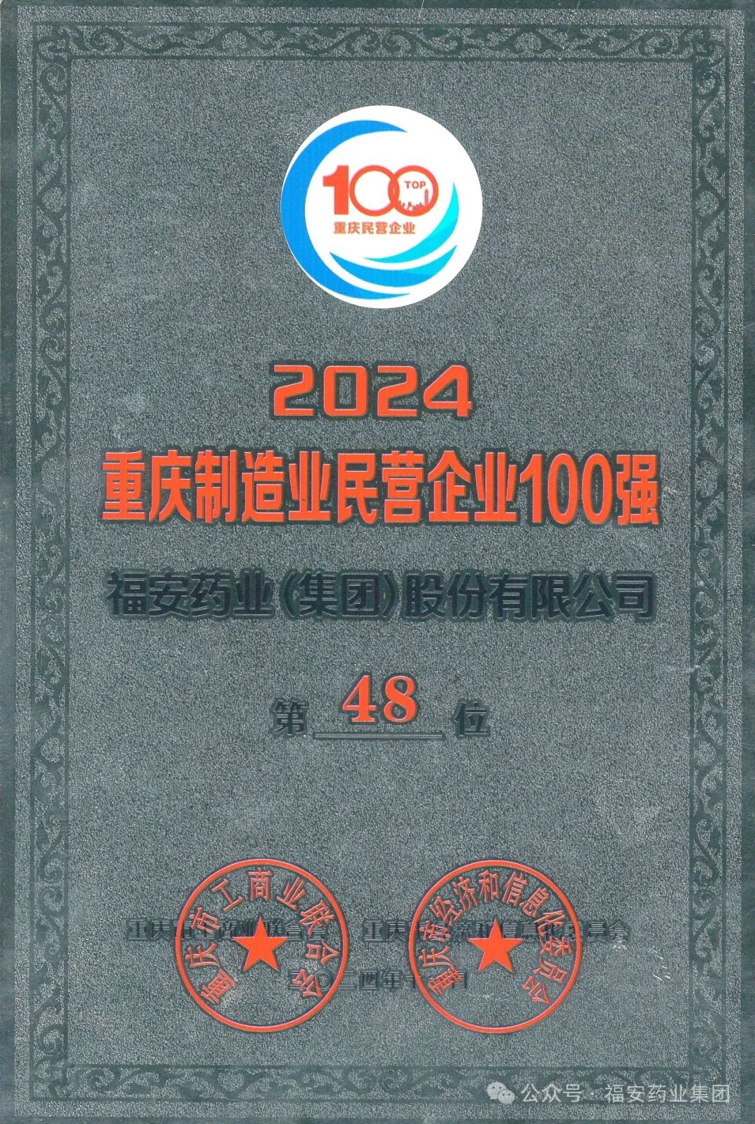 热烈祝贺:福安药业集团荣获2024重庆制造业民营企业100强、2024重庆民营企业100强