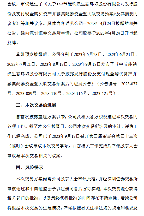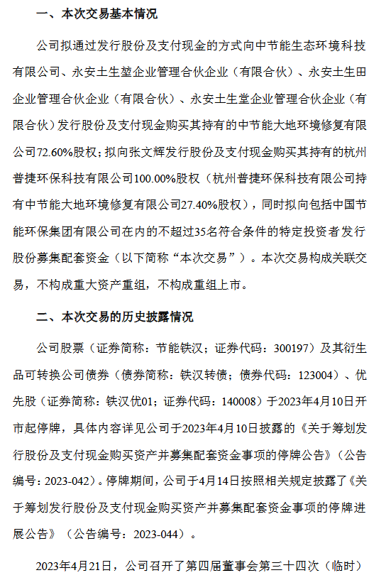 北极星环保网获悉,节能铁汉拟通过发行股份及支付现金的方式向中节能生态环境科技有限公司、永安土生堃企业管理合伙企业(有限合伙)、永安土生田企业管理合伙企业(有限合伙)、永安土生堂企业管理合伙企业(有限合伙)发行股份及支付现金购买其持有的中节能大地环境修复有限公司72.60%股权;拟向张文辉发行股份及支付现金购买其持有的杭州普捷环保科技有限公司100.00%股权(杭州普捷环保科技有限公司持有中节能大地环境修复有限公司27.40%股权),同时拟向包括中国节能环保集团有限公司在内的不超过35名符合条件的特定投资者发行股份募集配套资金(以下简称“本次交易”)。本次交易构成关联交易,不构成重大资产重组,不构成重组上市。