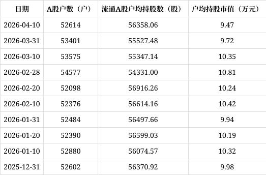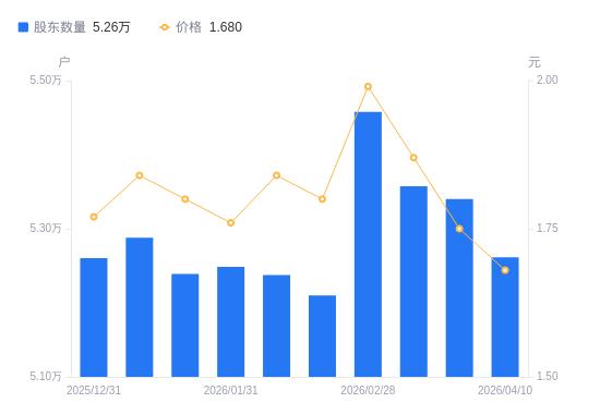 4月13日消息,数据显示,截至2026年4月10日,节能铁汉A股股东总户数为5.26万户,较上期(2026年3月31日)减少787户,降幅1.47%。公司最新A股总股本为29.65亿股,其中流通A股29.65亿股,户均持有流通A股数量为5.64万股,较上期增加830.58股,增幅1.50%;户均持流通A股市值9.47万元,较上期减少2491.55元,降幅2.56%。