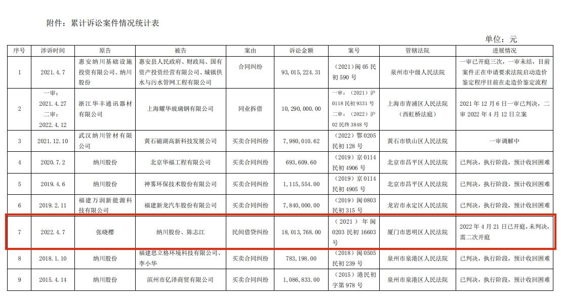纳川股份2022年4月29日披露的《关于累计诉讼的公告》显示,2022年4月7日,张晓樱起诉纳川股份、陈志江,案由为民间借贷纠纷,诉讼金额约为1801.38万元。该案已于2022年4月21日开庭,未判决,需二次开庭。