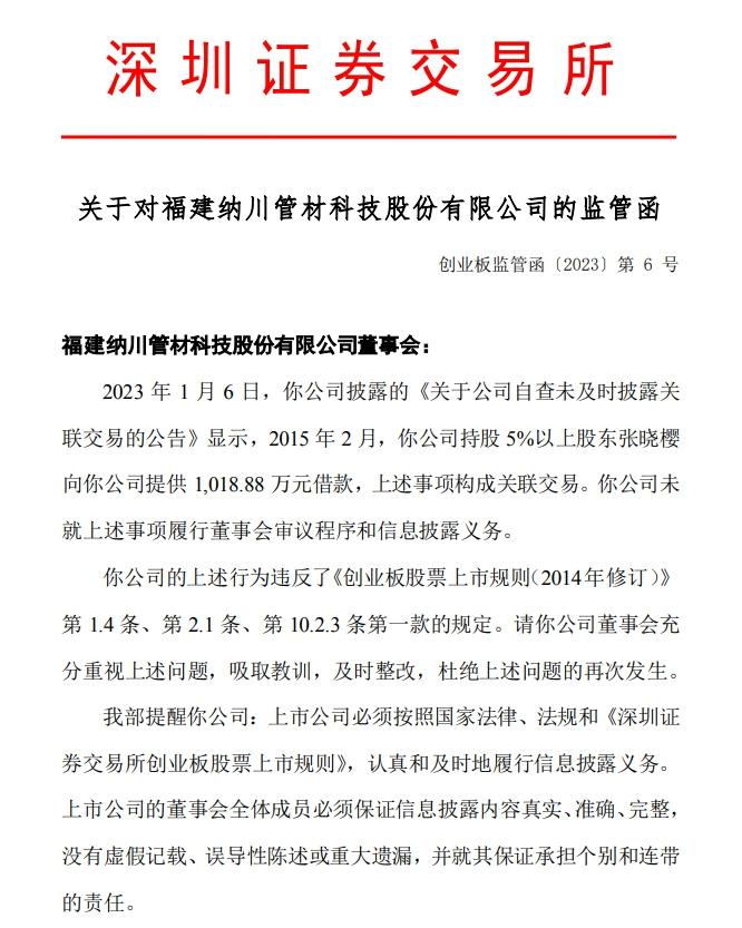 监管函称,2023年1月6日,纳川股份披露的《关于公司自查未及时披露关联交易的公告》显示,2015年2月,公司持股5%以上股东张晓樱向公司提供1018.88万元借款,上述事项构成关联交易。公司未就上述事项履行董事会审议程序和信息披露义务。