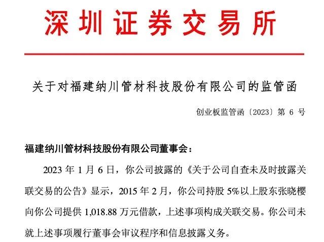 据监管函称,1月6日,公司披露的《关于公司自查未及时披露关联交易的公告》显示,2015年2月,公司持股5%以上股东张晓樱向公司提供1018.88万元借款,上述事项构成关联交易。公司未就上述事项履行董事会审议程序和信息披露义务。深交所指出,纳川股份上述行为违反了《创业板股票上市规则(2014年修订)》第1.4条、第2.1条、第10.2.3条第一款的规定。深交所要求纳川股份董事会充分重视上述问题,吸取教训,及时整改,杜绝上述问题的再次发生。