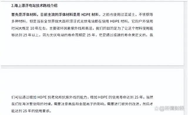 2、和远海大型固定类项目不同,漂浮类海上项目最重要的区别(增量)便是怎么让项目平稳浮于海面,即需要两个环节的共同合力——1、浮体材料(使项目平稳露出海面,相当于支架对于地面项目的重要意义)2、锚固系统(让项目不被海洋流冲走)