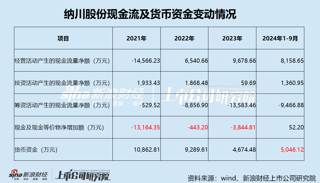 由于存量的贷款继续维持和 PPP项目的还本付息,纳川股份面临较大的经营资金压力,处于持续“失血”状态。2021年至今年前三季度,公司现金及现金等价物净增加额分别为-13164.35万元、-443.20万元、-3844.81万元和52.20万元,三年一期累计净流出1.74亿元。