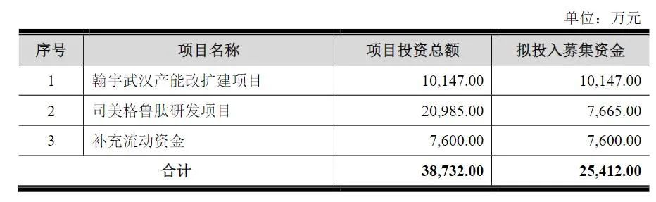公告显示,扣除相关发行费后,翰宇药业拟将募资金中1.01亿元用于“翰宇武汉产能改扩建项目”,拟向“司美格鲁肽研发项目”投入募资7665万元,另有7600万元用于补充流动资金。