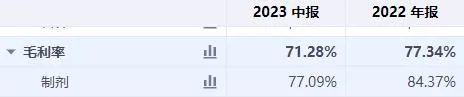 然需警惕的是,治剂这个主力营收近年呈下滑趋势。从2021年的6.08亿元降到2022年的5.75亿元。毛利率也从2022年的84.37%降到2023上半年的77.09%。